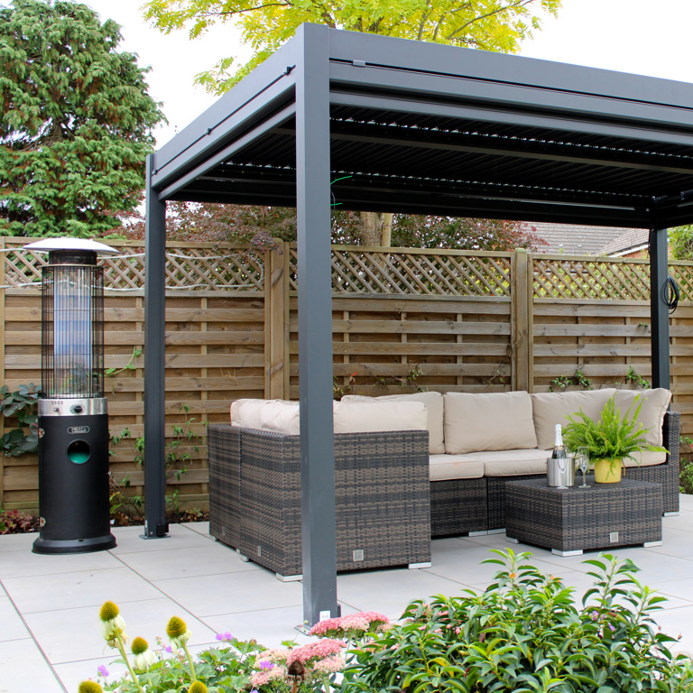 The main patio, which was slightly sunken, led up to a step and through Magnolia Umbrella Trees. As this garden received a high amount of sunshine each day, we created a pergola area, to offer protection and some shade. We installed aluminium pergola from White Stores that was louvered which meant that the roof could be opened or closed really easily.