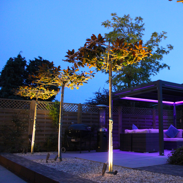 The planting installed was low maintenance, with colourful perennials for lots of summer colour. The lighting was really important in this garden as the clients loved to entertain. Uplighters on all trees were added, including a colour changing system on the main Pine tree, as well as festoon lighting in the rear seating area.