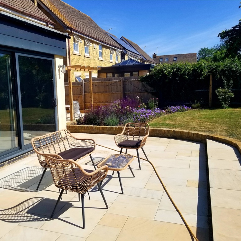 The stone effect house had a modern extension to the rear of the kitchen and we used dark weathered Imperial London bricks to tie these materials together when creating the new retaining edge for the patio and borders.
