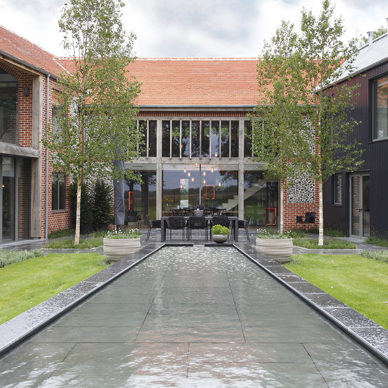 The clients were keen gardeners, and one wish was to have a greenhouse set amid a vegetable garden. A gorgeous Orangery style structure was chosen, and the design included a water feature which was added for further interest. Nicola and Viv designed the stone reflection pool to capture the sky and encourage wildlife, this was connected to a central terrace, creating the perfect place to drink in the view.